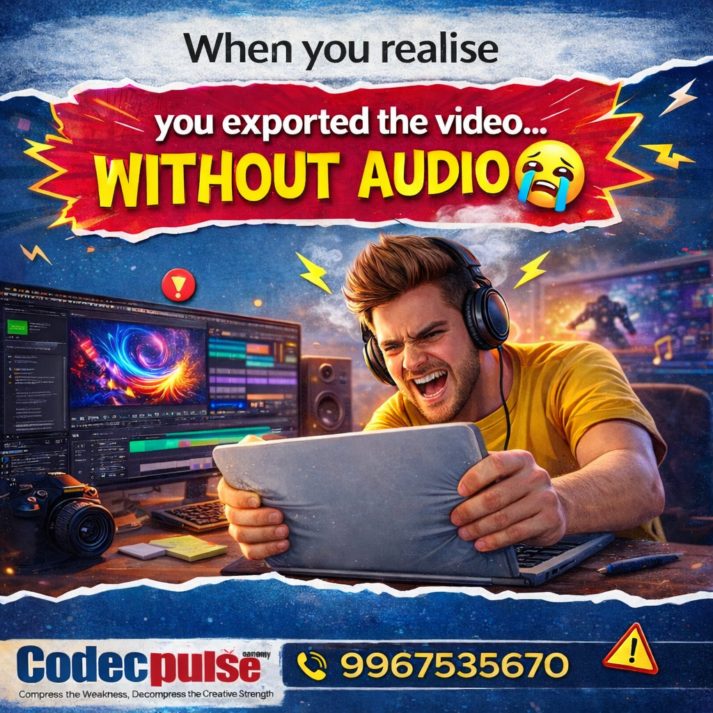😂 Every editor has faced this moment… When you export the video and realise there is NO AUDIO 😭 Creative problems only designers understand. If you love creating videos, animations and motion graphics, turn your passion into a creative career. 📍 Codecpulse Academy – Vile Parle East 📞 Call / WhatsApp: 9967535670 Limited Seats Available.